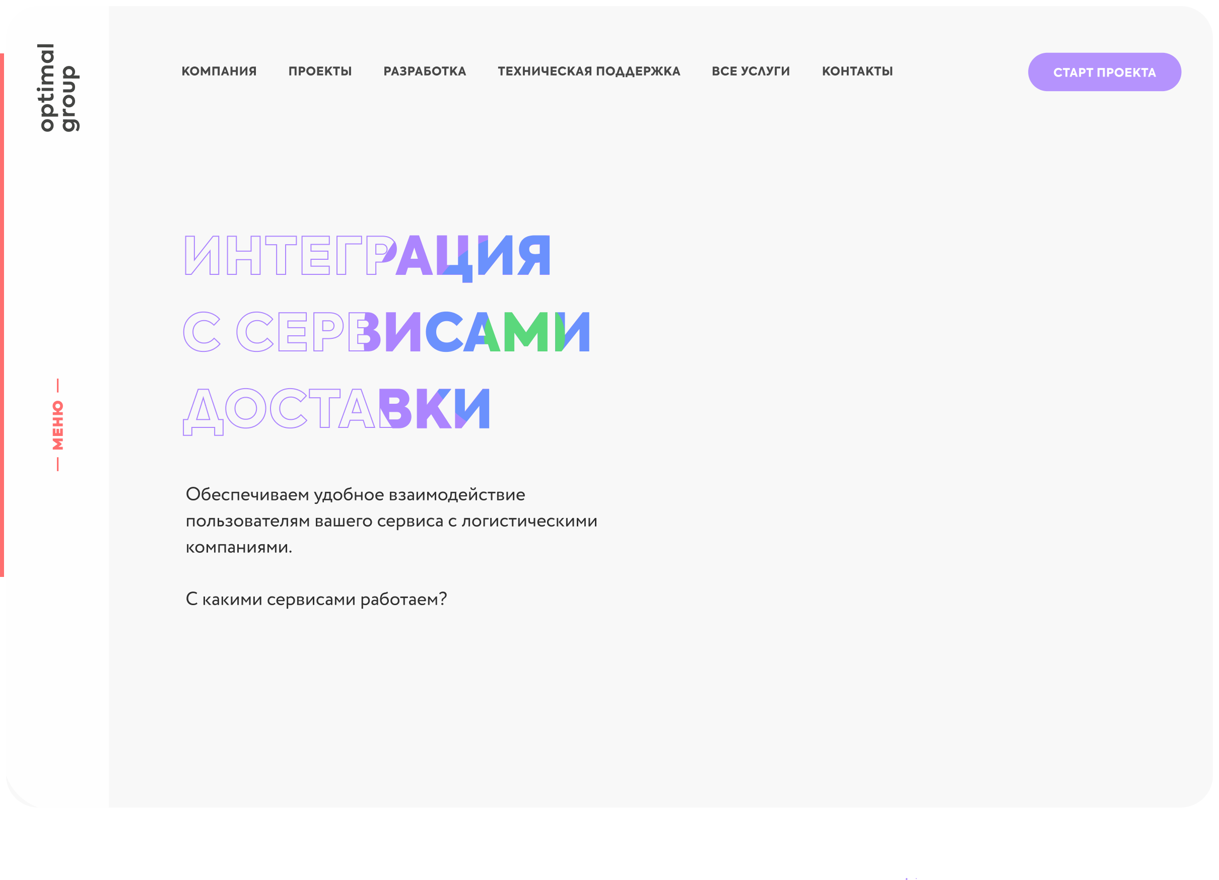 optimalgroup.ruМы провели глубинный анализ бизнес-процессов компании, разработали Customer Journey Map (CJM) и спроектировали интерфейс страниц корпоративного сайта. На этой основе подготовили дизайн и выполнили front-end-разработку — весь процесс был выстроен в соответствии с нашим подходом к UI/UX и продуктовому дизайну.