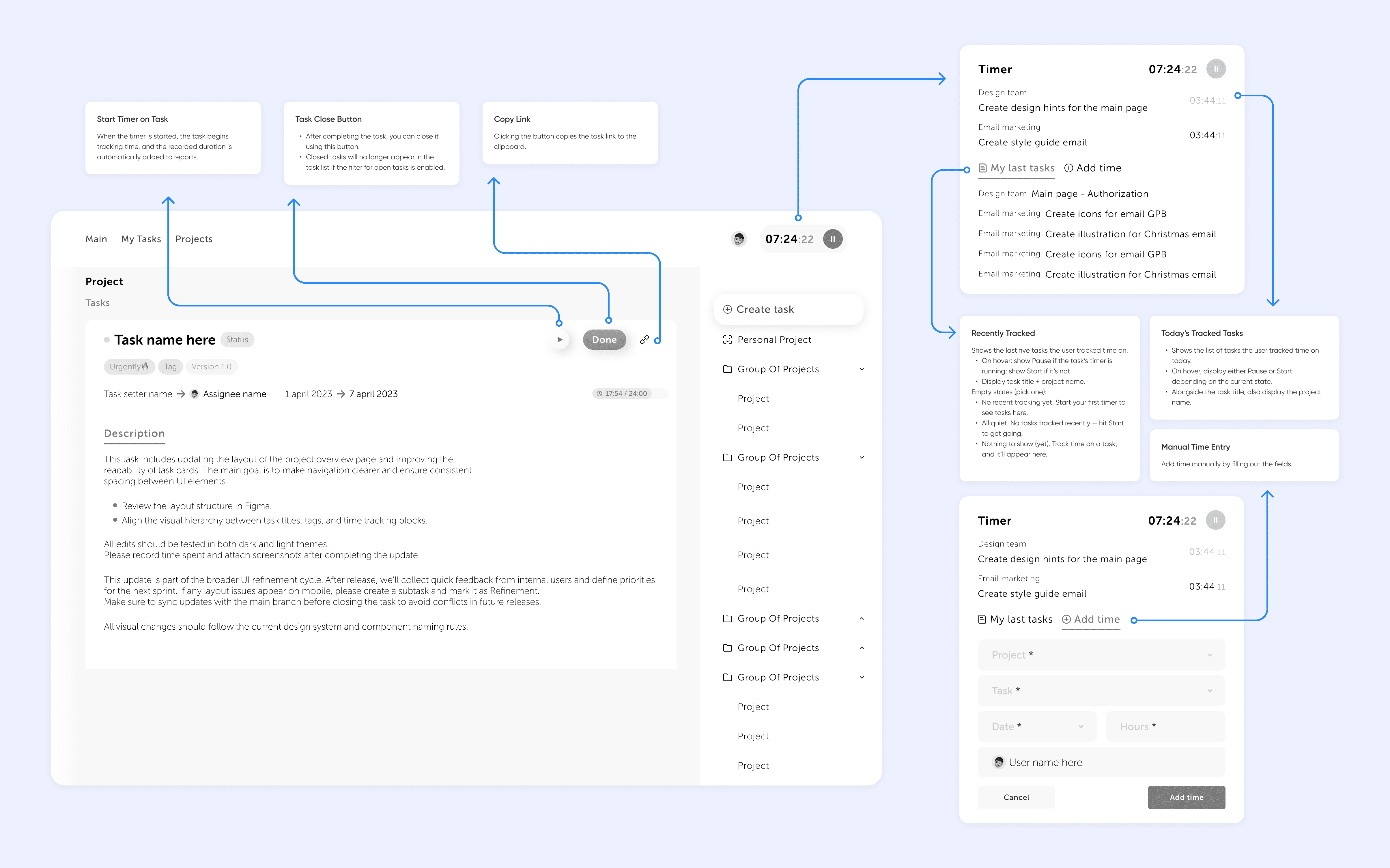 В Taskee есть встроенный учет времени, который помогает сохранять фокус и ответственность — без превращения работы в заполнение табелей. Таймер можно запустить прямо из карточки задачи или добавить время позже в пару кликов.